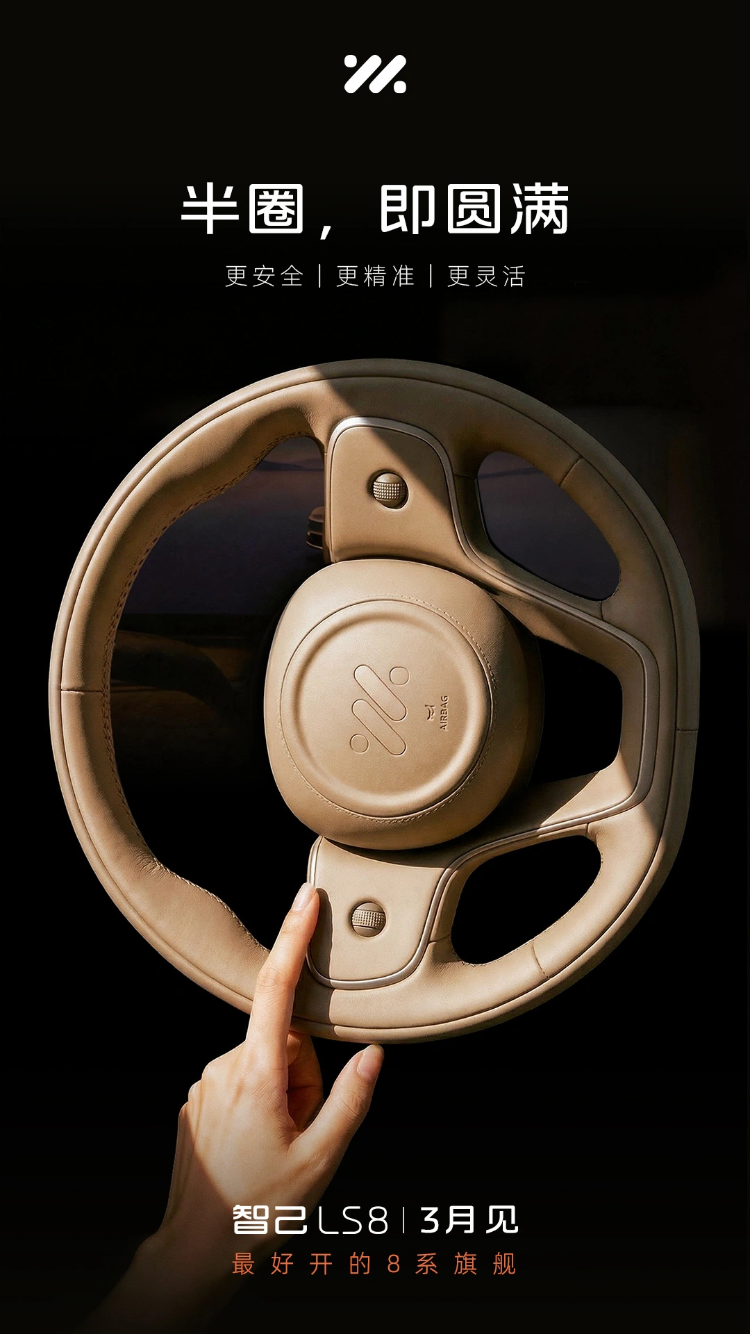 3 月 3 日消息,今晚智己汽车放出了一张旗下全新大型 SUV 智己 LS8 的预告图,预告图展示了新车的方向盘,“半圈,即圆满”暗示新车将采用线控转向技术,方向盘与转向机之间没有机械连接,转向比优化,打半圈即可完成传统方向盘一圈的转向幅度。同时海报还确认,新车将于 3 月发布。