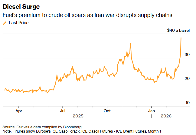 中东战事扰乱供应链,柴油相对原油溢价飙涨