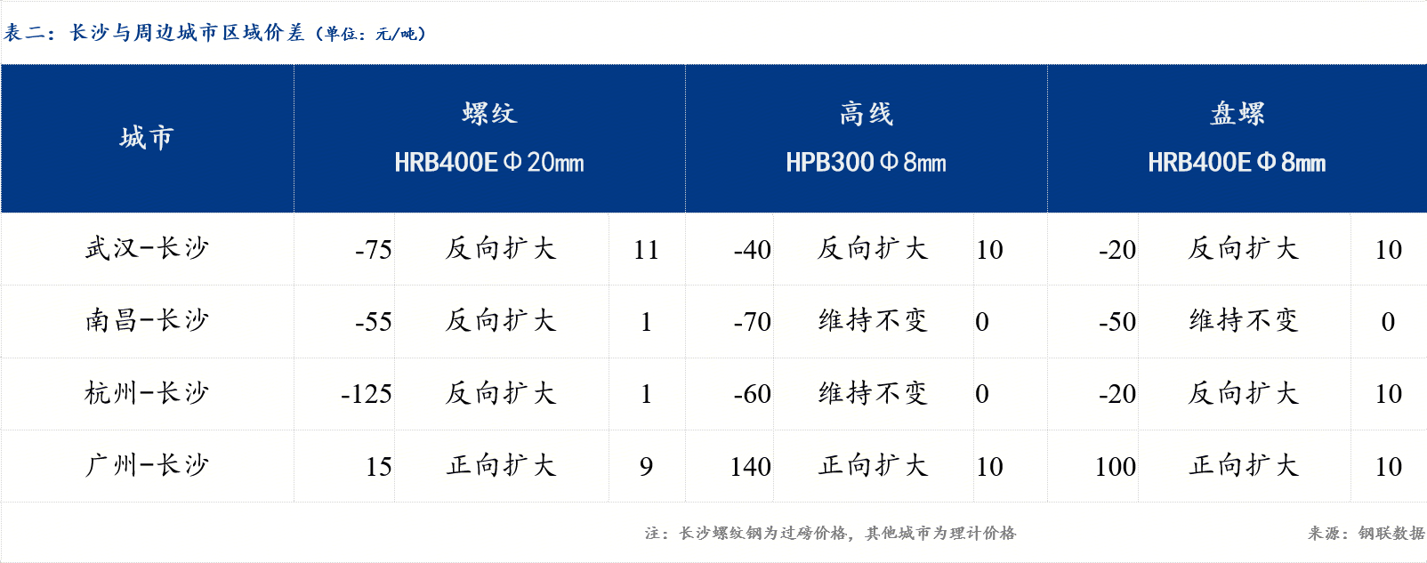 统一为理计单位后,武汉低于长沙75元/吨,价差扩大11元/吨;南昌低于长沙55元/吨,价差扩大1元/吨;杭州低于长沙125元/吨,价差扩大1元/吨;广州高于长沙9元/吨,价差扩大9元/吨。今日全国建筑钢材市场价格部分小跌,湖南与周边市场区域价差变化不大。