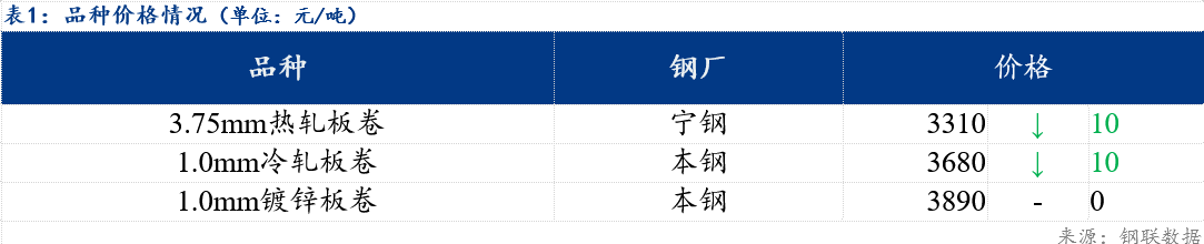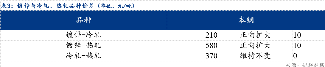 品种价差方面,镀冷价差为210元/吨,镀热价差为580元/吨,冷热价差为370元/吨。
