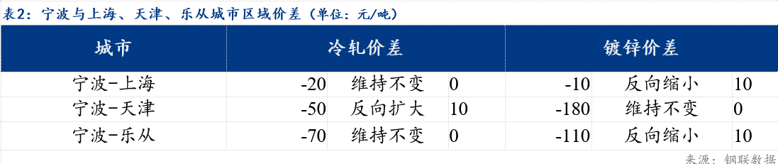 从价差方面来看,冷轧板卷宁波和上海的价差为-20元/吨,天津的价差为-50元/吨,乐从价差为-70元/吨;镀锌板卷宁波和上海的价差为0元/吨,天津价差为-180元/吨,乐从价差为-110元/吨。