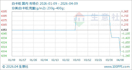 4月9日生意社白卡纸基准价为4303.33元/吨
