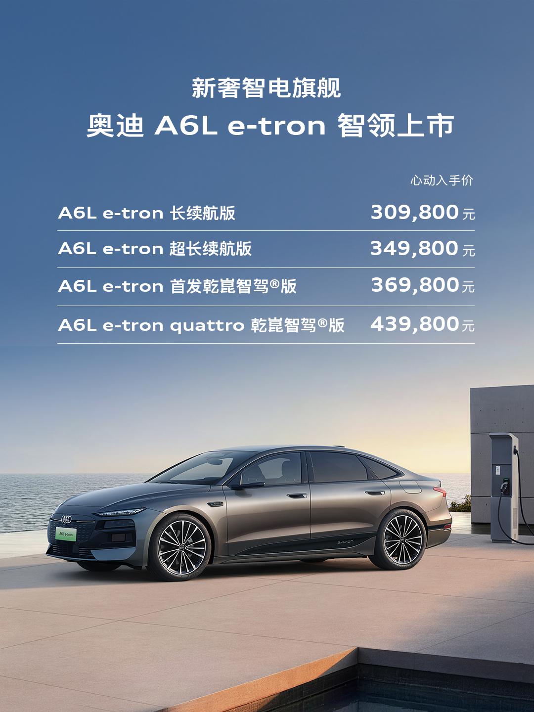 4 月 10 日消息,一汽奥迪 A6L e-tron 今晚正式上市,新车共推出 4 款车型,售价区间为 30.98 万元至 43.98 万元。