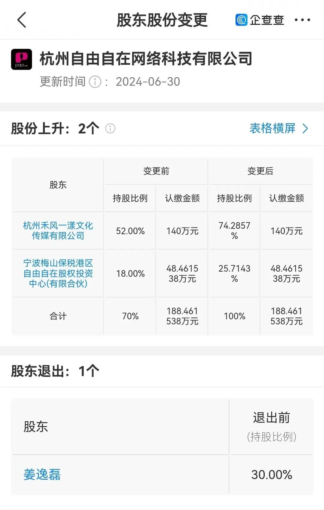 企查查APP显示,2024年5月,姜逸磊率先卸任papitube运营主体北京春雨听雷网络科技有限公司董事职务,退出全部管理岗位。同年6月底,其又退出papitube母公司杭州自由自在网络科技有限公司股东行列,退出前持股30%,至此完成股权与管理层面的全面解绑。目前,papitube由其合伙人杨铭主导运营。