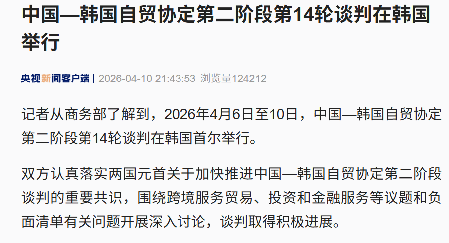 记者从商务部了解到,2026年4月6日至10日,中国—韩国自贸协定第二阶段第14轮谈判在韩国首尔举行。