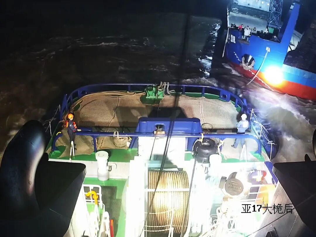 20时15分,救援船舶顺利抵达现场,此时海面风急浪高,失控船舶在风浪中剧烈晃动,救援难度极大。“亚洲十七号”轮船长张春雷迅速勘察现场环境、评估船舶状态,同时与多方保持实时联动。经与“海港103”轮反复研判救援方案后,最终敲定由“亚洲十七号”轮承担主拖任务。