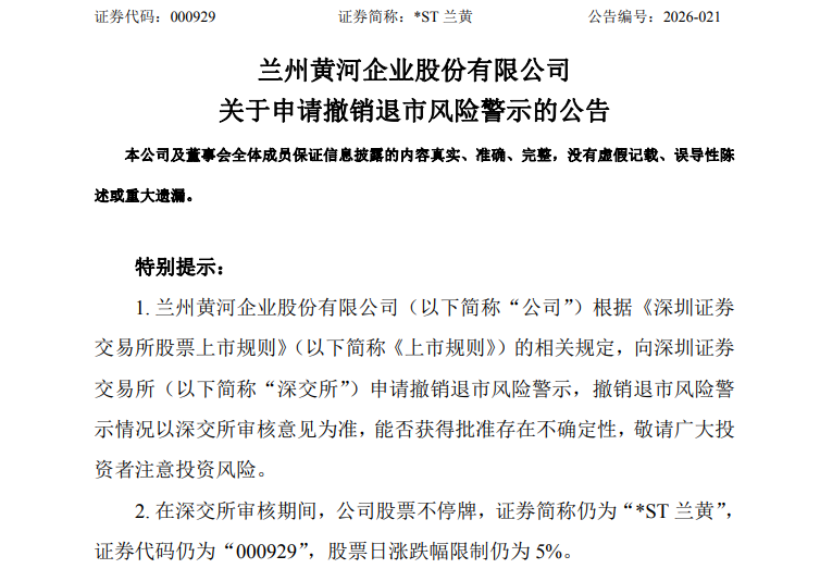 *ST兰黄同步公告,北京兴华会计师事务所(特殊普通合伙)对公司2025年度财务报告和内部控制出具了标准无保留意见类型的审计报告。公司2025年度经审计的利润总额、净利润、扣除非经常性损益后的净利润分别为-2.11亿元、-9093.95万元、.29亿元,扣除后的营业收入为3.61亿元,归属于上市公司股东的净资产为3.65亿元。根据上市规则相关规定,公司符合申请撤销退市风险警示的条件。公司拟向深交所申请撤销退市风险警示,撤销退市风险警示情况以深交所审核意见为准,能否获得批准存在不确定性。在深交所审核期间,公司股票不停牌。