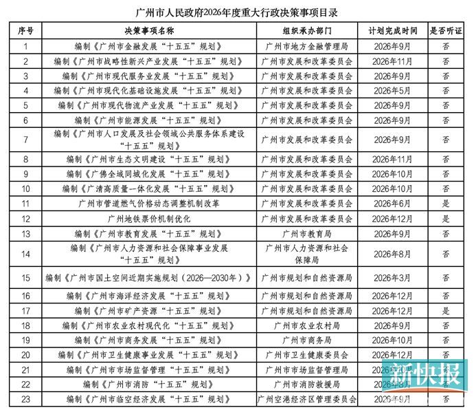 讯记者程羽报道记者4月12日获悉,广州市人民政府办公厅日前印发《广州市人民政府2026年度重大行政决策事项目录》(下称《目录》),公布了今年23项重大行政决策事项。