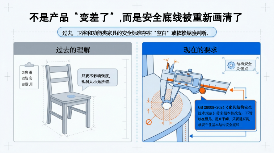 过去,一些家具(尤其是卫浴、功能类产品),在标准适用上存在分散甚至“空白”的情况。而随着GB28008-2024《家具结构安全技术规范》的实施,一个更明确的原则被提出:家具产品原则上应满足通用结构安全要求,避免结构性伤害风险。简单讲一句话:不管放在哪儿、用来干嘛,只要是家具,就要守住基本安全底线。过去一些依赖“经验判断”的设计,在新标准下,必须重新审视。