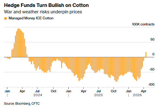 受伊朗冲突推动油价飙升的影响,天然纤维相对于日益昂贵的合成纤维的吸引力逐渐上升,资产管理机构已转为对棉花持净看多立场。
