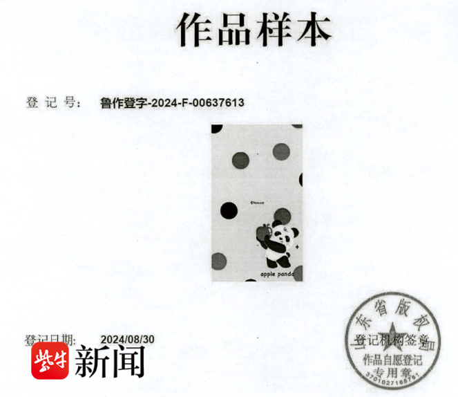 2024年4月10日,原告通过社交平台公开发表一幅名为《熊猫仔仔》的美术作品。图案以熊猫举着一颗苹果的卡通形象为主,再用波点纹样构图,搭配“apple panda”英文标识,整体风格简洁鲜明。同年8月30日,山东省版权局向原告颁发作品登记证书,依法确认原告享有作品著作权。后来,原告发现网上一些家纺产品使用了与之高度相似的图案,就向法院提起诉讼,请求判令相关店铺承担侵权责任。