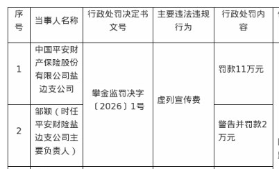 平安财险盐边支公司被罚11万,涉虚列宣传费