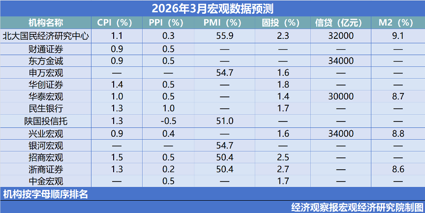 由《经济观察报》发起的“经济观察报月度观察”,每月发布一次。本次共有13家机构参与月度宏观数据预测。