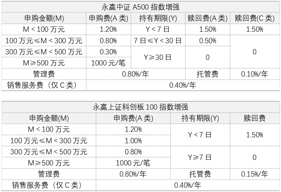 以下数据来源永赢基金,已经托管人复核:永赢中证A500指数增强A成立于2025/5/7,2025年净值增长28.39%,同期业绩基准为24.18%,业绩比较基准为中证A500指数收益率*95%+银行活期存款利率(税后)*5% 。基金经理钱厚翔任职时间2025/5/7-至今。永赢上证科创板100指数增强发起A成立于2024/5/28,业绩比较基准为上证科创板100指数收益率×95%+银行活期存款利率(税后)×5%。2024年/2025年净值表现为11.49%/62.00%,同期业绩基准表现分别为12.90%/51.64%。基金经理张璐自2024/5/28-2026/1/20任职,基金经理钱厚翔自2024/6/28起任职至今。费用信息详见基金合同及招募说明书。