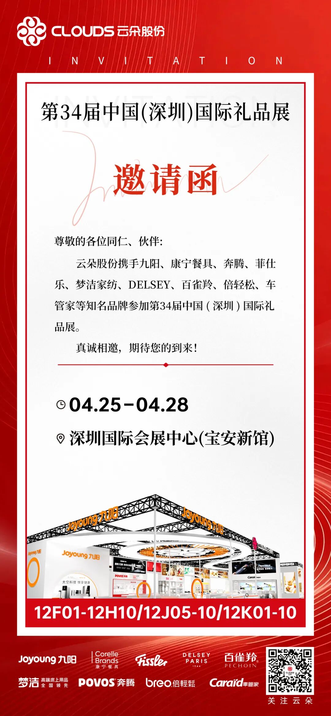 2026年4月25—28日,云朵股份携九阳、康宁餐具(Visions、Pyrex、Snapware、World Kitchen、Ekco)、奔腾、菲仕乐、梦洁家纺、DELSEY、百雀羚、倍轻松、车管家等众品牌集体参展亮相第34届中国深圳国际礼品展。