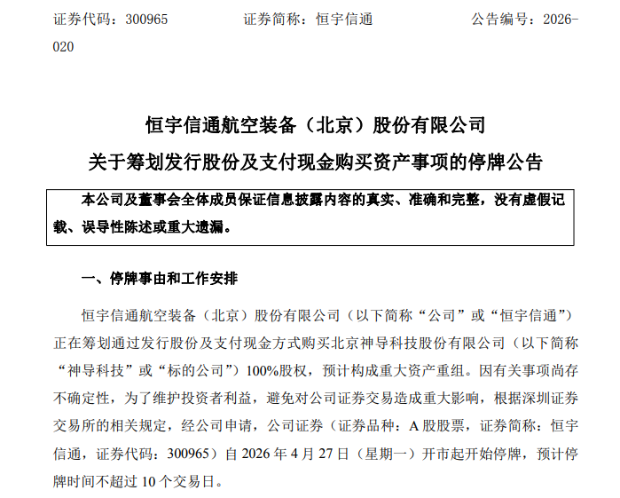 4月26日晚间,恒宇信通(300965)发布公告称,公司正在筹划通过发行股份及支付现金方式购买北京神导科技股份有限公司(以下简称“神导科技”或“标的公司”)100%股权,预计构成重大资产重组。因有关事项尚存不确定性,为维护投资者利益,公司股票自4月27日开市起停牌,预计停牌时间不超过10个交易日。