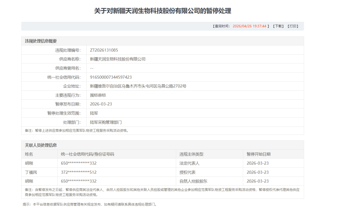 时隔一个月,天润生物再次被公示处罚(编号ZT2026131933),此次违规定性升级为“串通投标”,公示日期为2026年4月20日,处罚措施与此前一致,仍为暂停陆军采购资格,关联人员惩戒范围也与3月23日的公示基本一致,进一步明确了违规事实的调查结论。