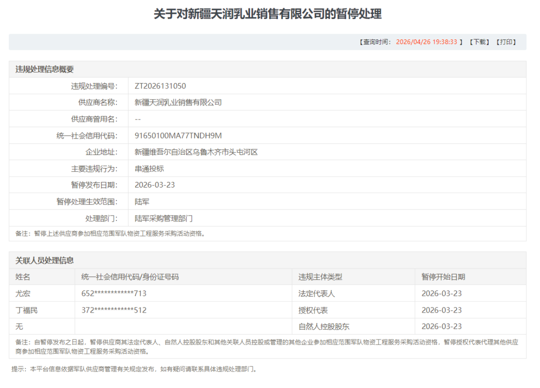 同日,天润生物也因违规被公示处罚(编号ZT2026131085),其违规行为被定性为“围标串标”,与天润销售的处罚生效日期、生效范围、处置部门完全一致,均自2026年3月23日起暂停参与陆军采购资格。天润生物作为天润乳业旗下核心子公司,统一社会信用代码为916500007344597423,注册地址为乌鲁木齐市头屯河区乌昌公路2702号。