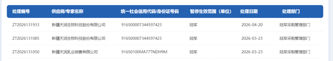 近日,军队采购相关平台陆续公示了对新疆天润生物科技股份有限公司(以下简称“天润生物”)及新疆天润乳业销售有限公司(以下简称“天润销售”)的违规处理决定,两家企业均因投标违规被暂停参与陆军采购活动资格,多名核心关联人员同步受到穿透式惩戒,凸显了军队采购领域对违法违规行为的“零容忍”态度。