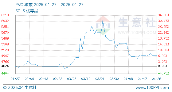 PVC基准价为4967.00元/吨,与本月初(5256.00元/吨)相比,下降了5.5%。