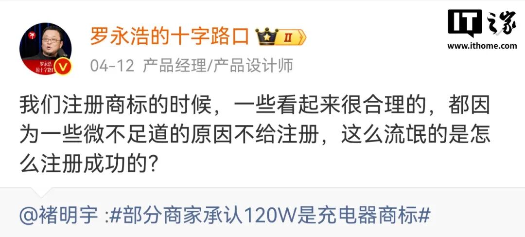 罗永浩也发文,对商家能将“120W”成功注册为商标表态不理解。