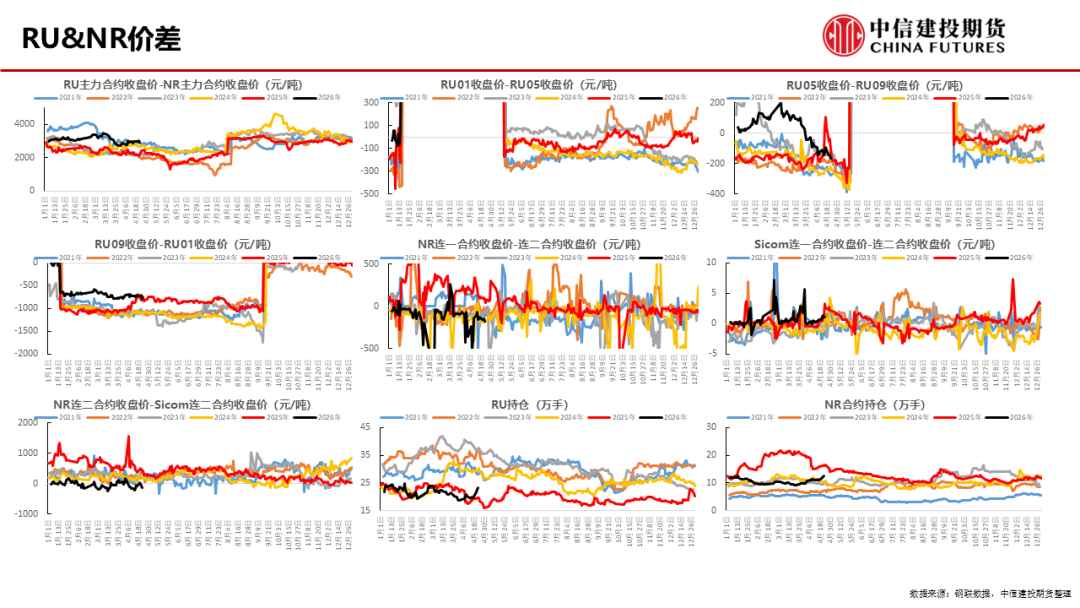 价差:本周混合胶对RU主力合约的基差为-875元/吨;越南3L对RU主力合约的基差为280元/吨,盘面冲高回落后,盘面窄幅震荡。 泰国混合胶6月价格对NR06合约升水258元/吨,标混价差窄幅震荡,预计全年泰混仍将维持对NR的升水结构。 本周RU的91价差-785元/吨,远期升水近期波动有限。
