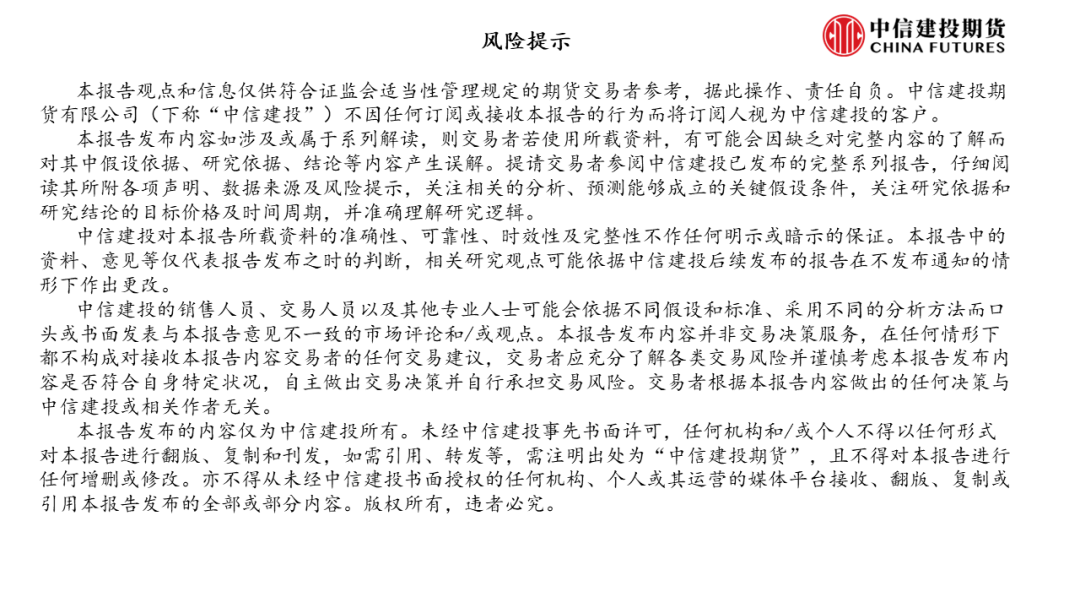 本报告发布的内容仅为中信建投所有。未经中信建投事先书面许可,任何机构和/或个人不得以任何形式对本报告进行翻版、复制和刊发,如需引用、转发等,需注明出处为“中信建投期货”,且不得对本报告进行任何增删或修改。亦不得从未经中信建投书面授权的任何机构、个人或其运营的媒体平台接收、翻版、复制或引用本报告发布的全部或部分内容。版权所有,违者必究。