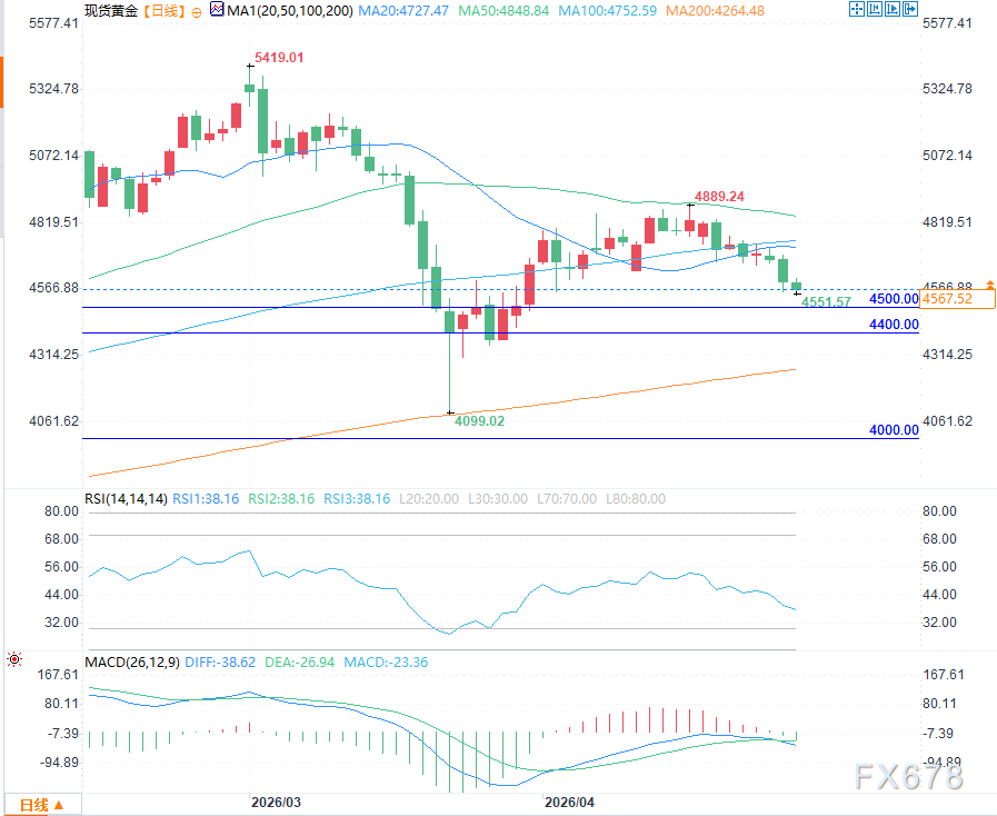 若抛售压力持续,现货黄金(XAU/USD)的下一个下行目标或在4500美元/盎司附近,随后是4400美元/盎司区域;长期支撑位仍维持在4000美元/盎司左右,这一位置也是机构普遍看好的长期配置关口,若能成功守住,黄金有望逐步企稳回升。