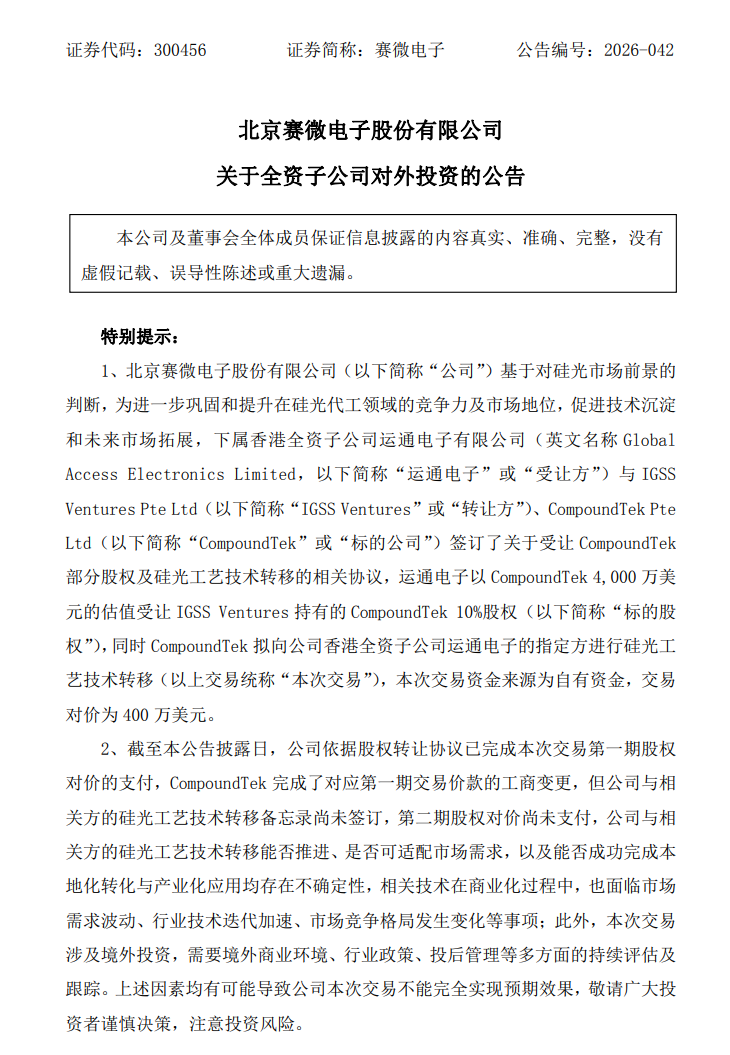 4月30日,赛微电子(300456.SZ)公告称,基于对硅光市场前景的判断,为进一步巩固和提升在硅光代工领域的竞争力及市场地位,促进技术沉淀和未来市场拓展,公司下属香港全资子公司运通电子与IGSS Ventures、CompoundTek签订了关于受让CompoundTek部分股权及硅光工艺技术转移的相关协议,运通电子以CompoundTek4000万美元的估值受让GSS Ventures持有的CompoundTek10%股权,同时CompoundTek拟向公司香港全资子公司运通电子的指定方进行硅光工艺技术转移,本次交易资金来源为自有资金,对价为400万美元。