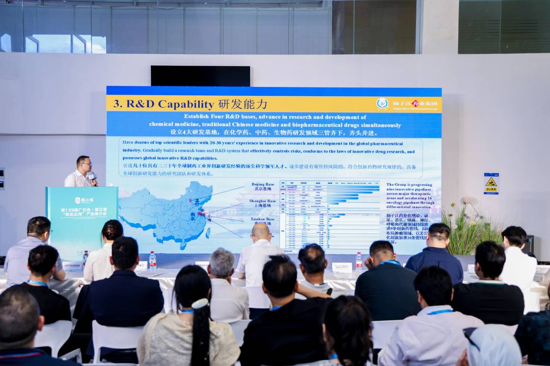 推介会现场,扬子江药业集团四川海蓉药业有限公司、四川都江堰青城茶叶有限公司、温特莱恒一食品(成都)有限公司、都江堰天赐猕源农业有限公司等四家本地企业依次登台展示,充分呈现了“蓉品出海”优质产品的核心竞争力。