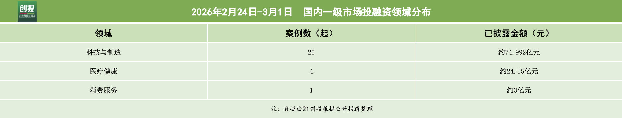 21创投不完全统计,3月2日—3月8日,国内一级市场共披露融资事件25起,覆盖科技与制造、医疗健康、消费服务三大领域。其中有19笔融资披露了融资金额和币种信息,已披露融资总规模合计超100亿人民币。