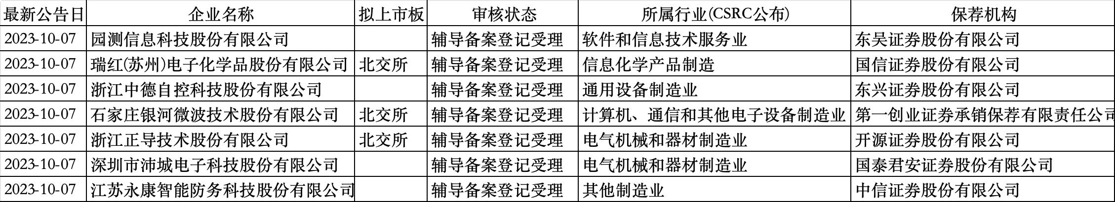 证监会网站显示,10月7日共有7家公司启动A股IPO辅导。其中,新三板公司银河股份、正导技术和瑞红苏州相继启动了北交所上市辅导。