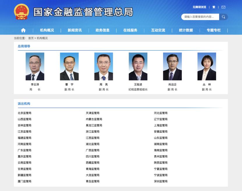 截至券商中国发稿,金融监管总局官方网站“机构设置”栏目尚未更新,仍只显示了当前领导班子成员及各地方监管局信息。
