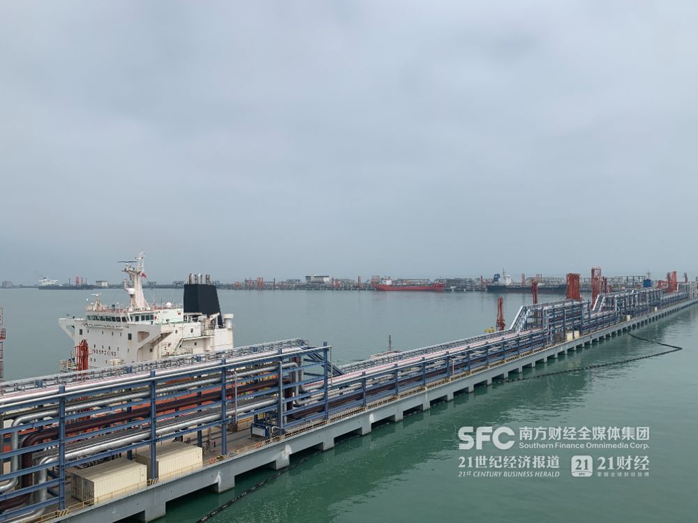 放眼望去,这里没有物流港起落不停的龙门吊、来回穿梭的货车,只有绵延的管道、作业的船只。不远处的30万吨级原油码头,也泊有一艘黑色油轮。