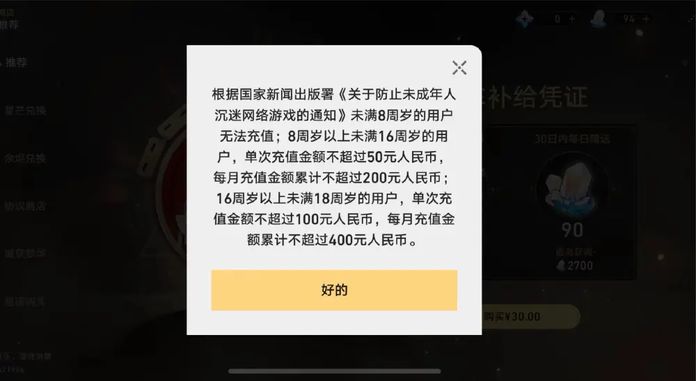 (图说:米哈游《崩坏:星穹铁道》充值限制提示)