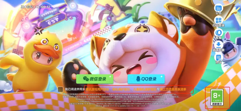 (图说:腾讯《元梦之星》中,开始游戏前要求用户勾选阅读且同意用户协议与隐私政策、第个人信息清单、后方可进入游戏,且右下角适龄提示为8+)