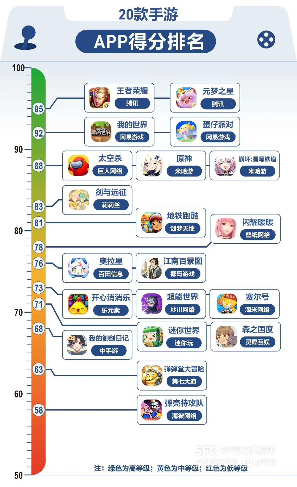 从具体得分情况来看,此次测评结果中,得分为高等级的手游增多。包括《王者荣耀》《元梦之星》、《我的世界》《蛋仔派对》《太空行动》《原神》《崩坏:星穹铁道》《剑与远征》《地铁跑酷》共9款,相较上年增加了2款。