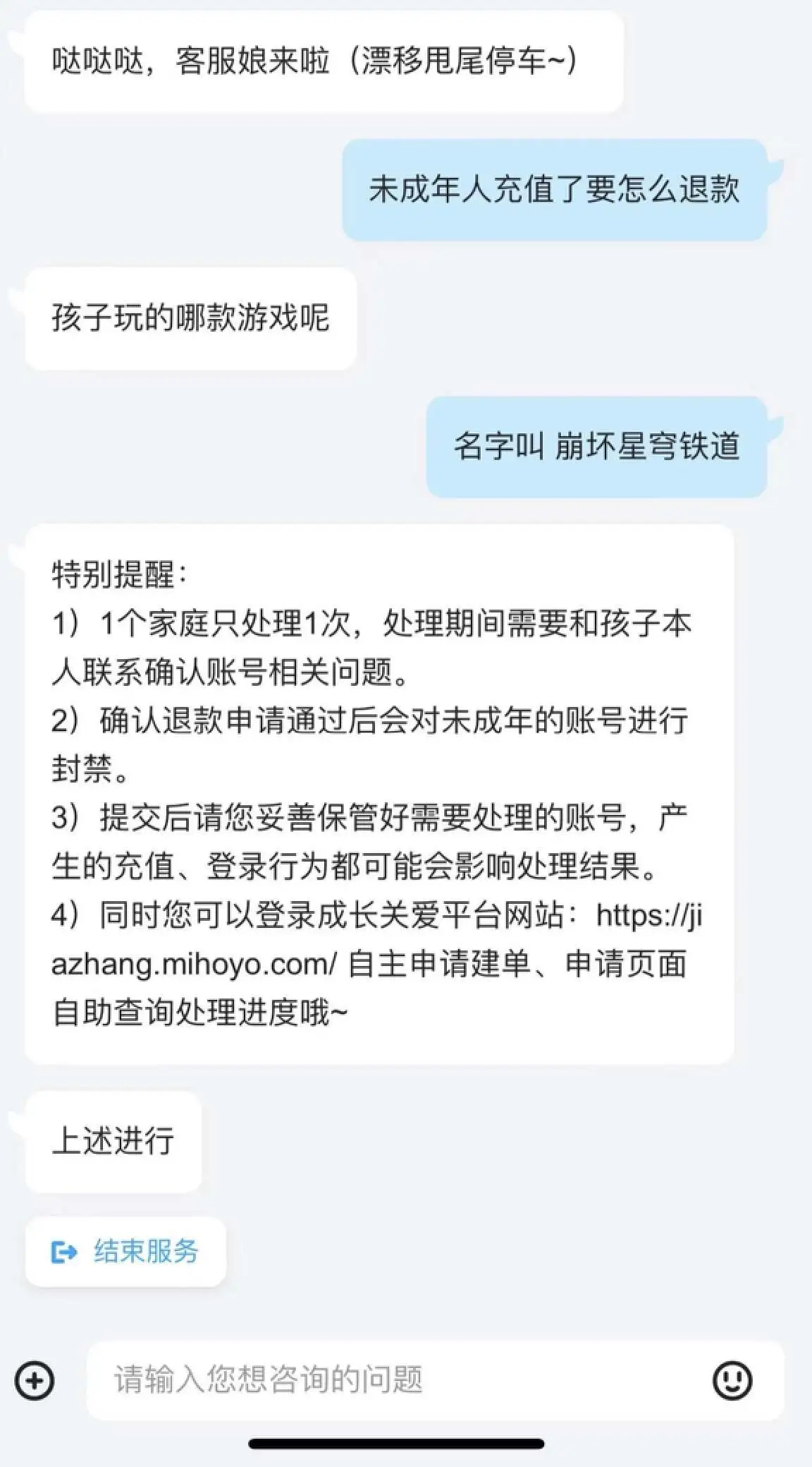 以《王者荣耀》为例,在咨询客服未成年人退款相关事宜后,平台通过微信客服平台进行引导,具备完整的退款路径;米哈游旗下《崩坏:星穹铁道》站内客服则会通过直接提供退款申请方式,并指出确认退款申请后会对相关账号采取封禁措施,家长可通过成长关爱平台查询处理进度。
