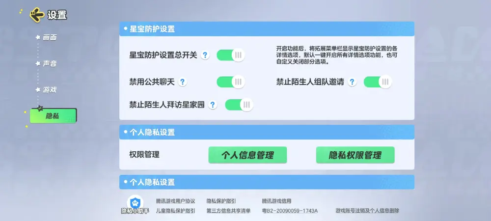 如腾讯《元梦之星》,在“设置”-“隐私”界面上线了“星宝防护设置”功能,可以执行一键屏蔽陌生人组队邀请、禁止公共聊天、禁止陌生人拜访星家园等设置。