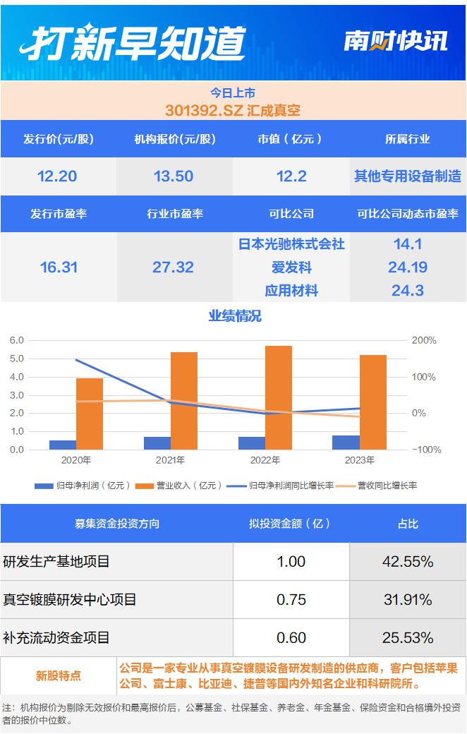 6月5日,汇成真空(301392)在创业板上市,该公司是国内领先的真空镀膜设备厂商,也是工信部授予的第三批专精特新“小巨人”企业。