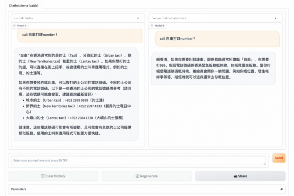 当以粤英混用的方式问到“Call白车打咩number?”时,商量立马理解这是要叫救护车的意思,并给出“在香港,应拨打999”的解决方案,而GTP 4 Turbo则以为用户想叫不同颜色(公司)的出租车。