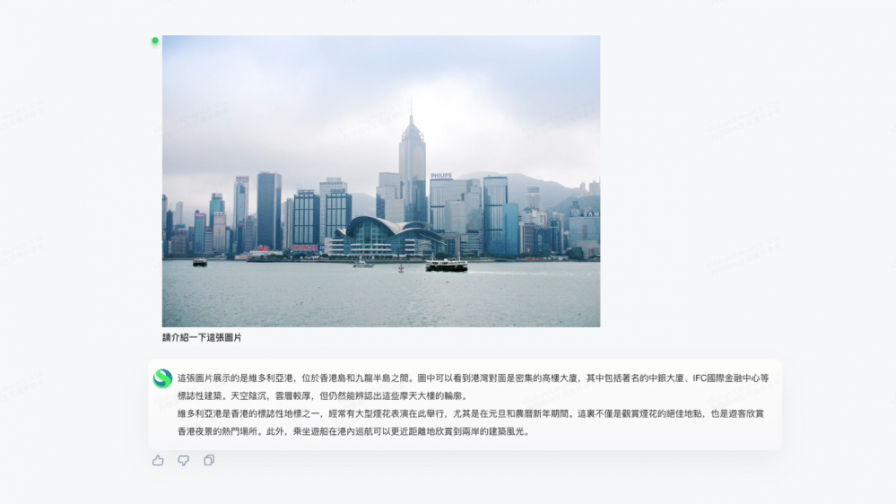 “商量粤语版”的多模态能力,则对具备粤语地区文化特色的图片展现了精准的理解。在一幅展示维多利亚港的照片中,它不但能辨认其中著名的地标建筑,如“中银大厦”“IFC金融中心”等,还介绍维多利亚港是“观赏烟花的绝佳地点”“游客欣赏香港夜景的热门场所”。