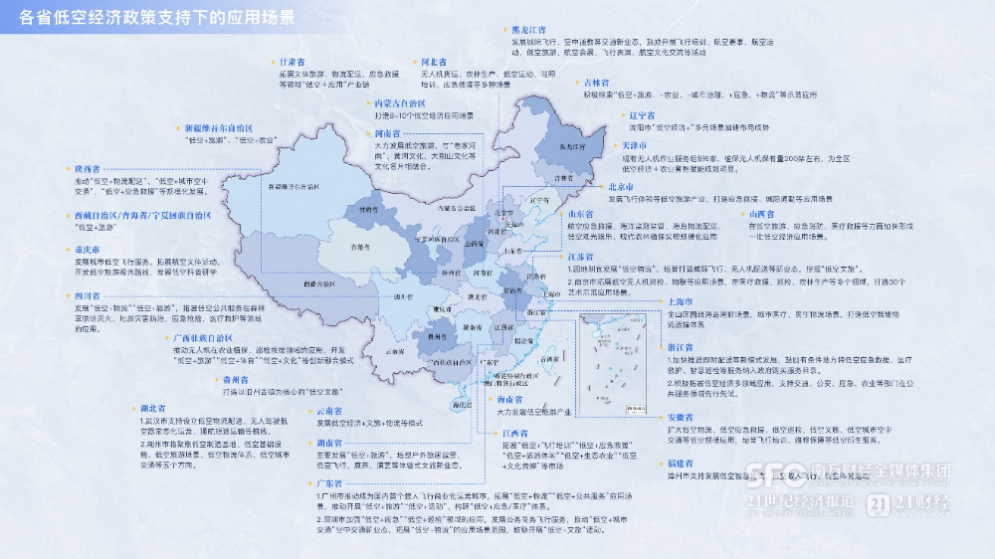 而从各地政策及产业动向来看,广东、上海、四川等拥有较强航空或电动汽车产业链基础的省份(市)纷纷布局eVTOL(电动垂直起降飞行器)制造环节,其余大部分省市聚焦飞行基础设施和航线建设、应用场景拓展三方面,将低空经济与旅游、农业、城市治理、应急、交通等领域相结合,催生一系列创新应用热点。