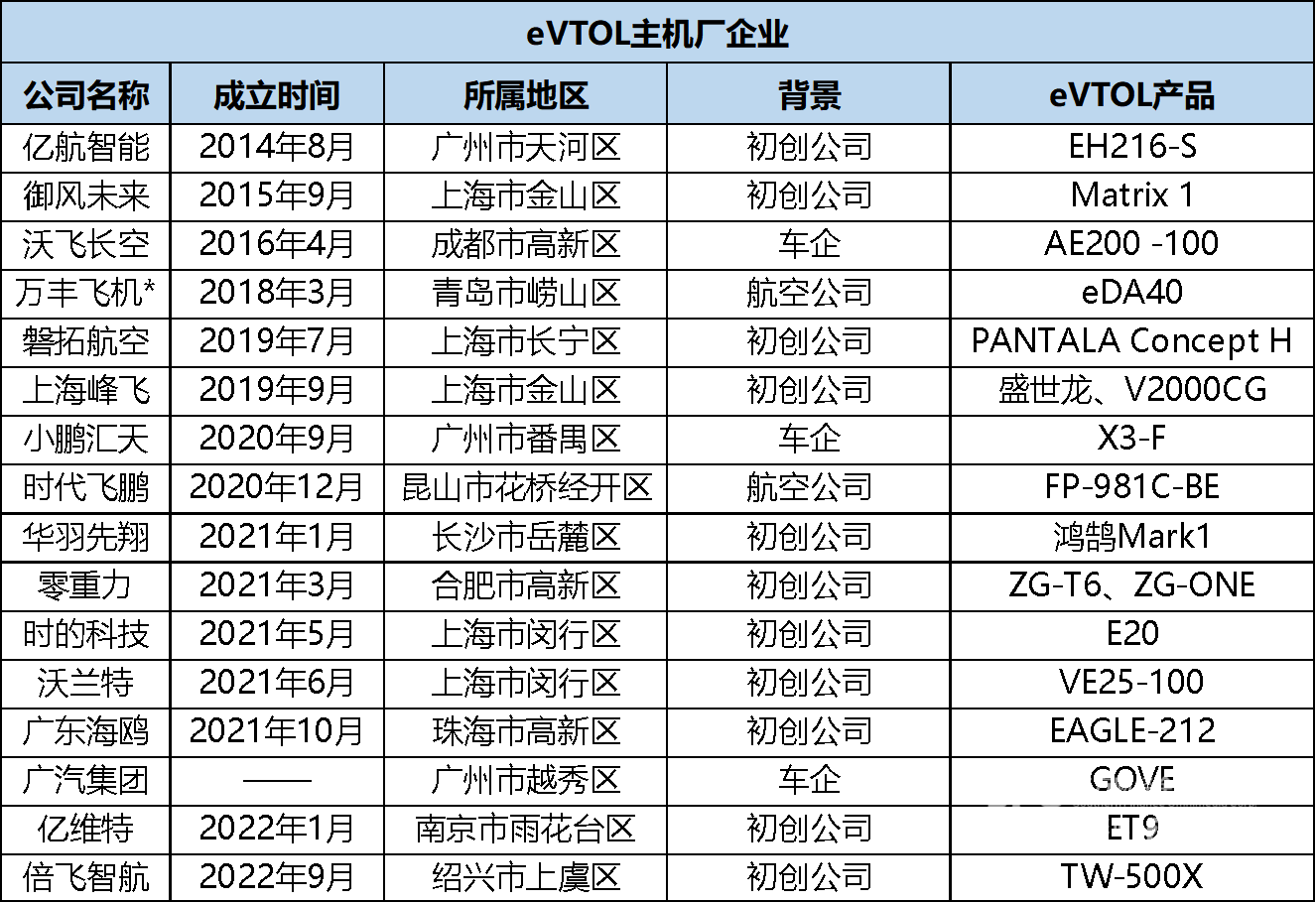 因此,eVTOL企业大体也可分为三类:飞机企业、汽车企业和初创公司。传统航空企业有如中国航空工业集团、航天时代飞鹏、万丰工业飞机等;汽车企业则以新能源汽车企业为主,比如吉利汽车通过成立沃飞长空并与德国Volocopter建立合作,小鹏汽车通过其子公司小鹏汇天,以及广汽集团通过推出飞行汽车GOVE,进军eVTOL市场;eVTOL领域的初创公司通常由航空业内的资深人士和学术界的高校权威所创立,比如亿航、峰飞、时的科技、御风未来等。