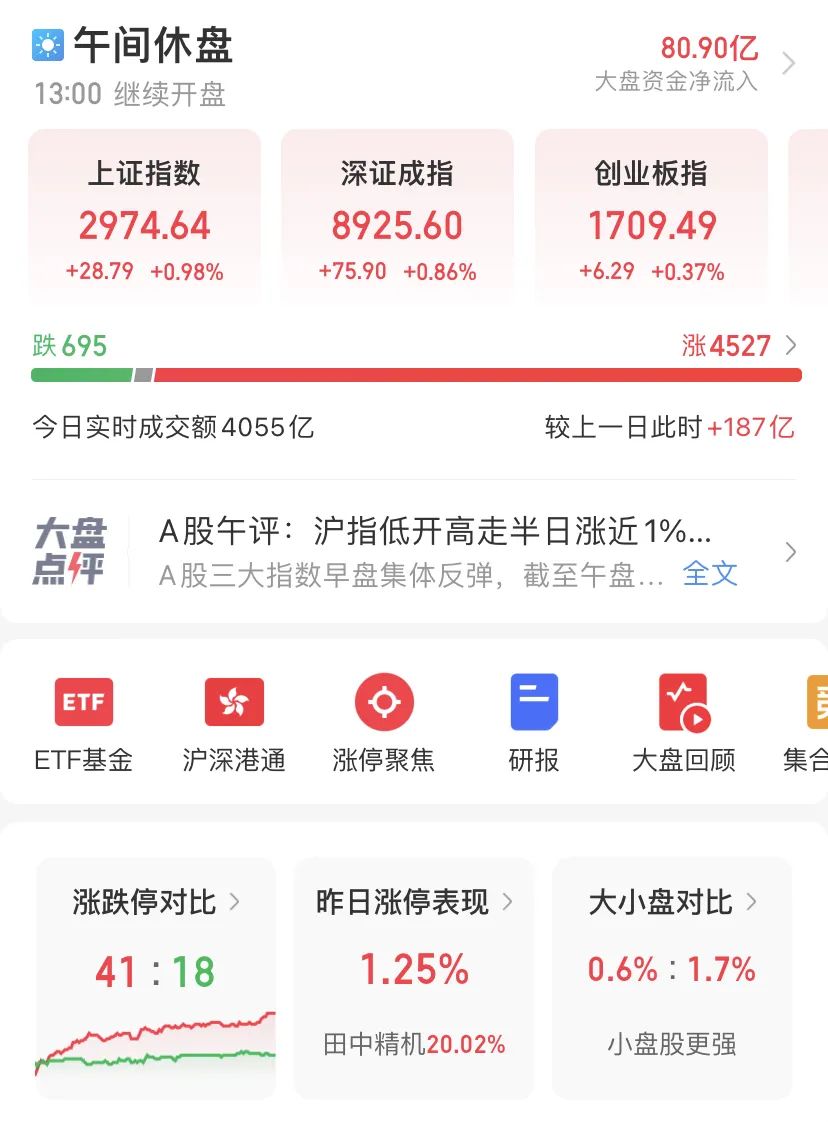 上午收盘,主要指数都是红盘。上证指数涨0.98%,深成指涨0.86%,创业板指涨0.37%,科创50指数涨0.57%,个股普涨,4527只个股上涨,695只股下跌,上午成交额4055亿元。