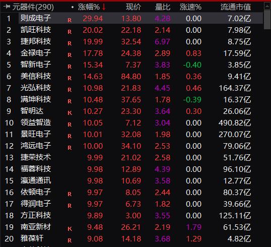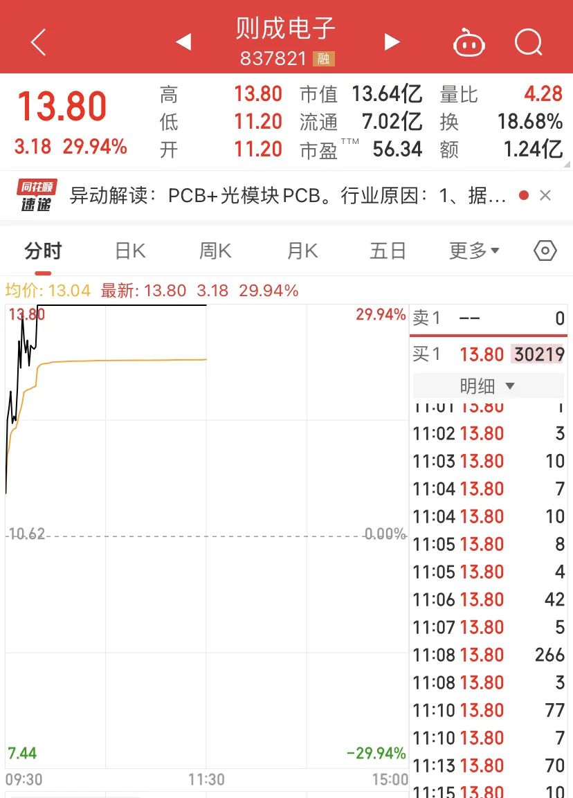 北交所的则成电子30%涨停领先。