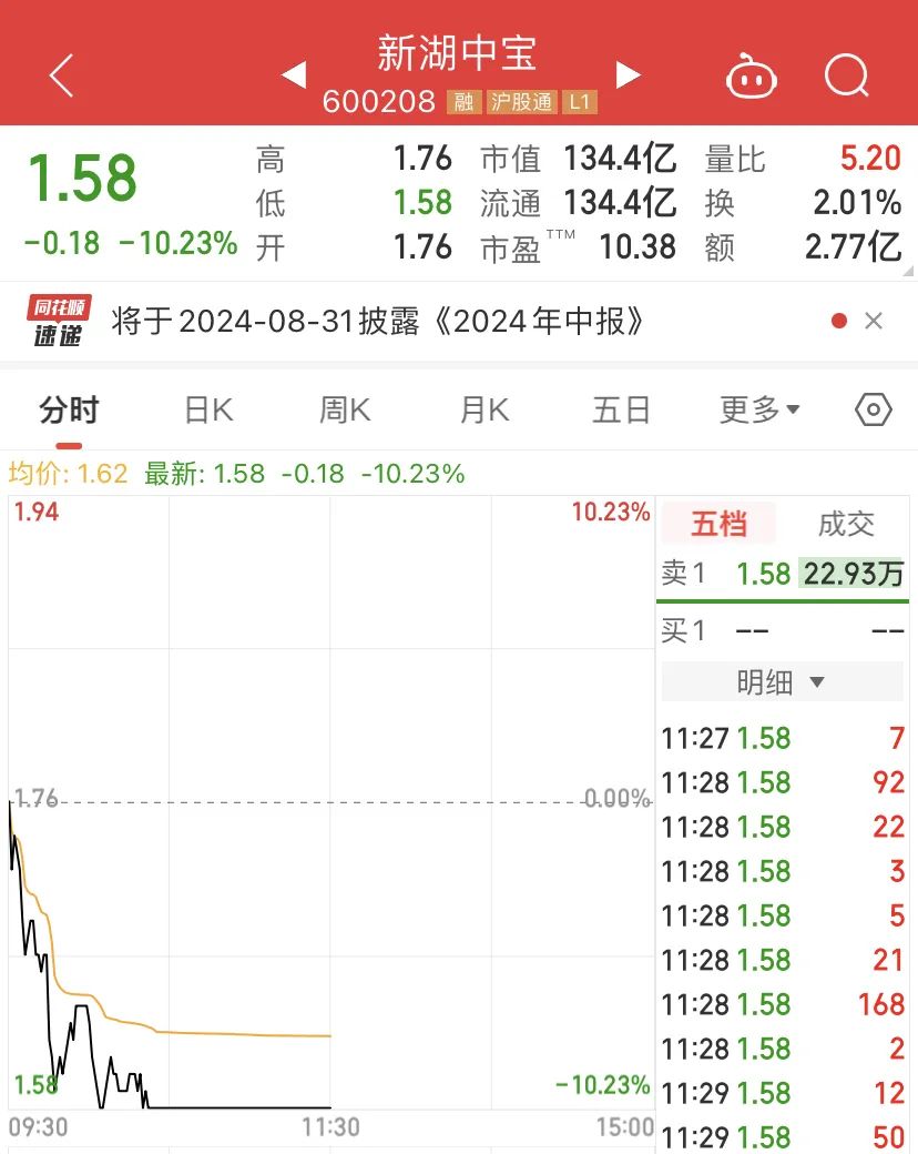 虽然市场普涨,也有个股大幅下跌。超百亿市值的新湖中宝(600208),开盘后一路走低闪崩跌停。跌停后市值仍达134亿元。