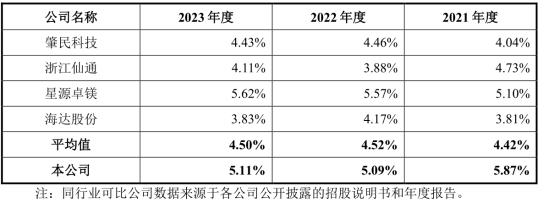 横向对比来看,2021年—2023年,科力装备同行业可比公司肇民科技(301000)、浙江仙通(603239)、星源卓镁(301398)、海达股份(300320)的研发投入占比均值分别为4.42%、4.52%、4.50%。研发投入占比长期高于同行业可比上市公司平均研发投入占比。