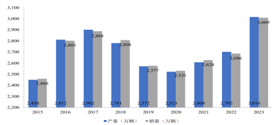 据中汽协数据,2019年—2023年,全国汽车产量分别为2572.1万辆、2522.5万辆、2608.2万辆、2702.1万辆、3016.1万辆;销量分别为2576.9万辆、2531.1万辆、2627.5万辆、2686.4万辆、3009.4万辆。其中,2023年,全国汽车产销量同比分别增长11.6%、12%,产销量创历史新高,实现两位数增长。