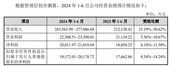 公司预计今年上半年实现营业收入26.56亿元至27.71亿元,同比增长25.19%至30.62%;净利润为2亿元至2.1亿元,同比增长6.16%至11.50%;扣非后归母净利润为1.92亿元至2.02亿元,同比增长8.54%至14.24%。
